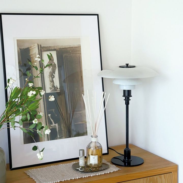 チェストの上には手軽なスタンドライトを。