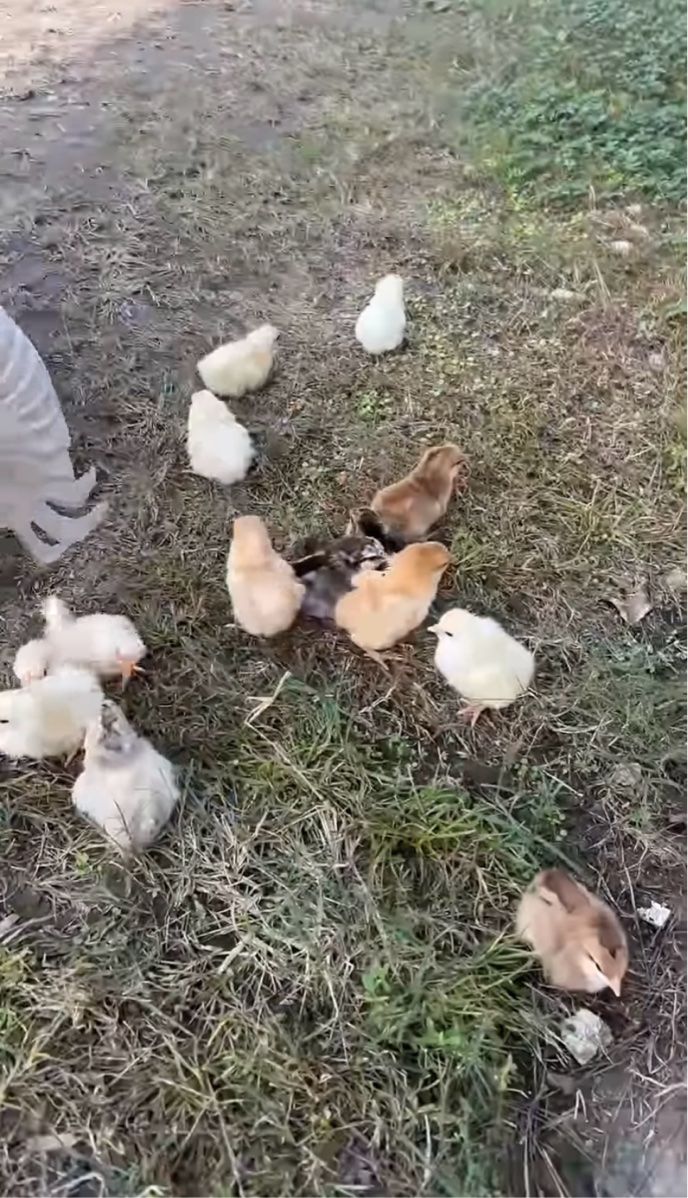 その言葉に反応したのか、それとも飼い主さんが手を伸ばしてきたのに驚いたのか、勢いよく飛び上がったメンドリ。 するとビックリ、この子が座っていた場所から大勢のヒヨコたちが姿を現しました!!