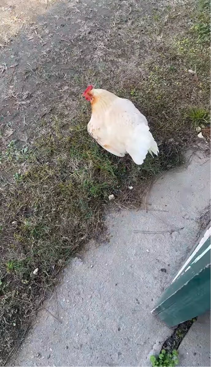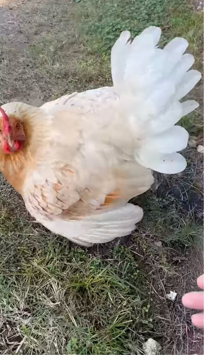 地面に腰を下ろしてくつろいでいるかのように見えるメンドリの姿。 ところが、その行動を怪しんだ飼い主さんが声をかけてみると、意外な事実が判明しました!