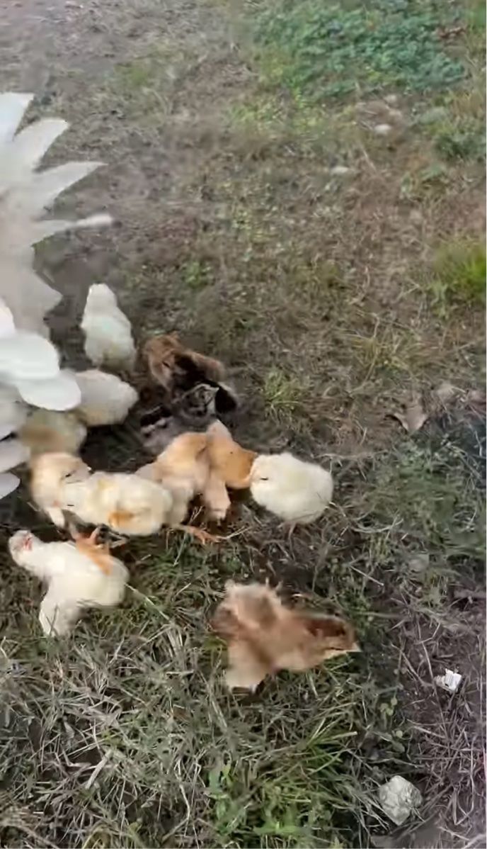 のんびりくつろいでいるように見えて、13羽のヒナを温めていたメンドリ。 予想外の展開は、こちらの動画からご覧いただけます。
