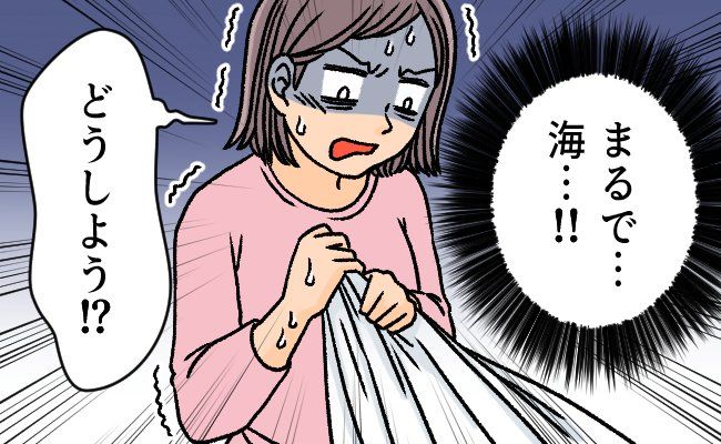 そして、なんだか自分の下半身に嫌な感触を覚えて……。目線をおしりのほうに向けると、そこには経血の海が! 「ちょっと漏れた」程度ではなくビックリしてしまいました。