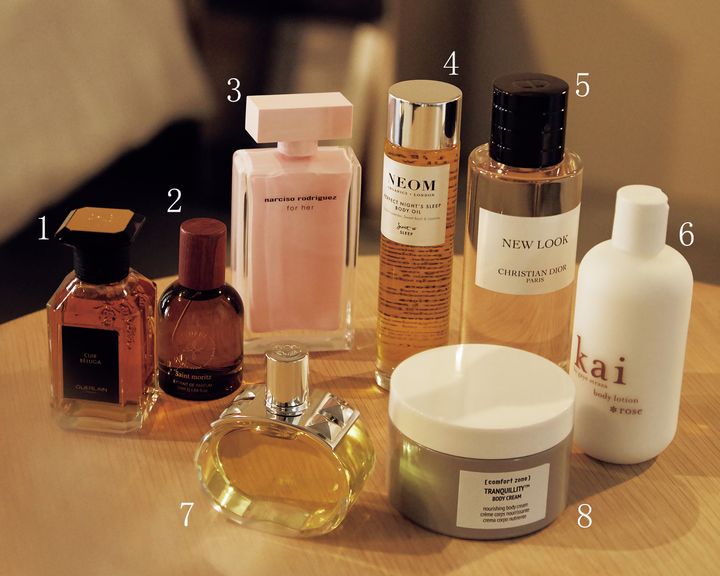 1「人肌と混じり合うと、より一層深みのある香りに」ラール エ ラ マティエール・アンジェリーク ノワール-オーデパルファン 100ml ¥49,500(ゲラン) 2「韓国ブランド。シーンを選ばず初対面の方からどこのですかと聞かれる香り」Youssoful エクストライト・ディ・パフューム セントモーリッツ 50ml ¥6,960(BARUDA) 3「色気のある香りはこれ」ナルシソ ロドリゲス フォーハー オードパルファム 100ml ¥20,790(ナルシソ ロドリゲス パルファム) 4「すがすがしい柑橘系」NEOM ボディオイル TRQ 100ml ¥7,700(ステキ・インターナショナル) 5「懐かしさとともに新しさを感じる斬新な香り」メゾン クリスチャン ディオール ニュールック オードゥ パルファン 250ml ¥55,880(パルファン・クリスチャン・ディオール) 6「ごく柔らかくローズが香ります」kai ボディ ローション ローズ 236ml ¥7,370(レイジーワークス)7「今一番纏うことの多い香り」バレニア オードパルファム100ml ¥24,860(エルメスジャポン) 8コンフォートゾーン トランキリティ ボディ クリーム 180ml ¥14,300(コンフォートジャパン)