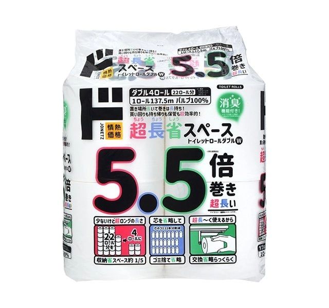 「超長省スペース トイレットロールダブルW 5.5倍巻き」は、“省”にこだわったトイレットペーパーです。22ロール分を4ロールにまとめたぶん、交換回数が減って収納場所を確保できます。芯も省略したことでゴミ捨て不要に。