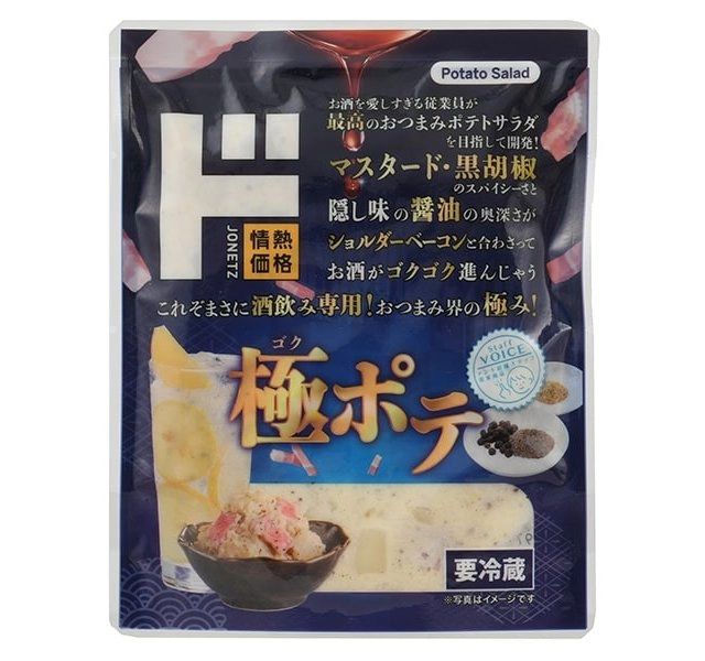 お酒好きの従業員がお酒好きのために最高のポテサラとして開発したのが「極ポテ」。お皿に移すだけでおつまみが完成します。ショルダーベーコンとマスタードや黒胡椒、隠し醤油の奥深さが相まって、お酒がどんどん進みます。
