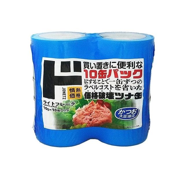 ドンキホーテのヒット商品のひとつ「ライトツナフレーク かつお10缶パック」。缶はラベルレスしたことにより安い価格で提供できるとのこと。1缶80円台(税込)とコスパも◎