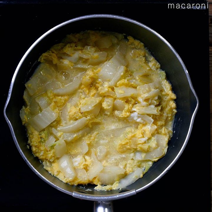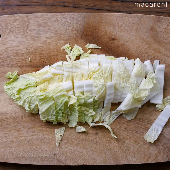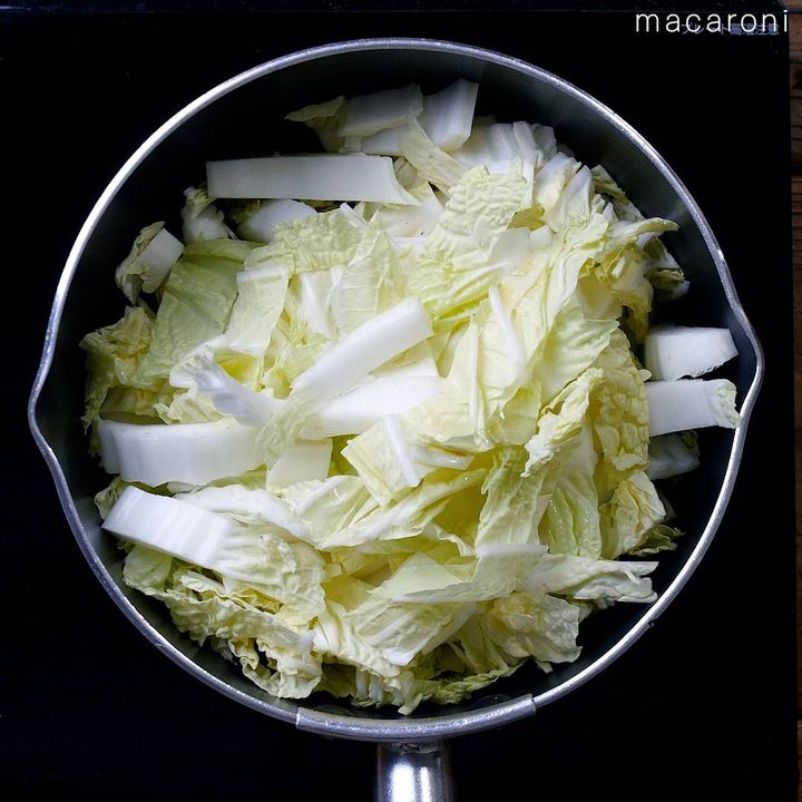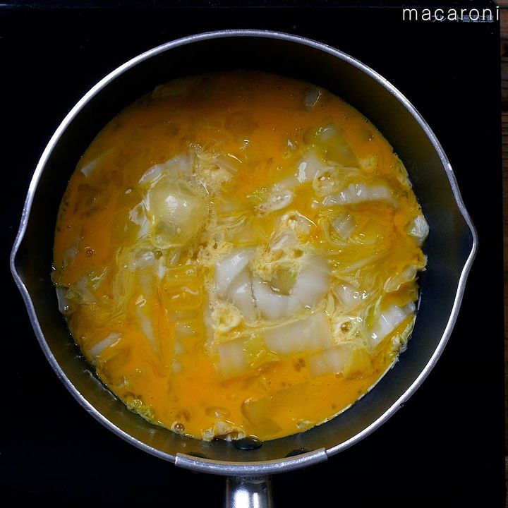 3: 沸騰したら火を弱めて5〜6分、白菜がやわらかくなるまで煮込みます。