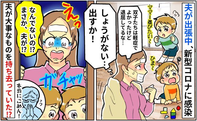 3. 夫の出張中、妻と双子は体調不良に…しかしワンオペで乗り切るための大事なモノを、夫が持ち去っていて!?