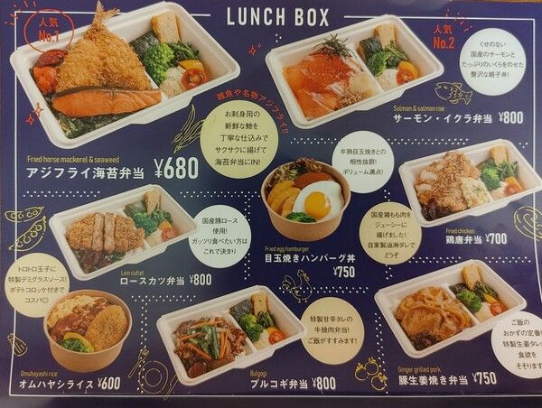 以前伺ったときは「タコ飯&白身フライ」や「豚キムチ弁当」などがありました。