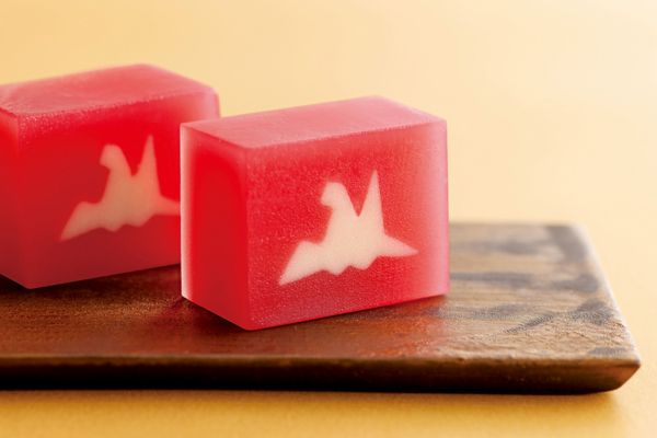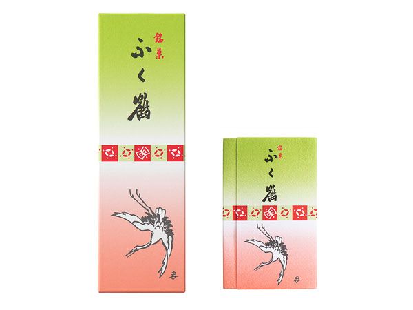 「鶴は千年、亀は万年」…鶴は長寿を象徴するおめでたい鳥。高く響き渡るその鳴き声は天へも届き、天界へ通じる鳥とも言われています。「ふく鶴」はその縁起を折鶴模様にこめた、吉例の意匠羊羹。今から50年前に誕生したこのお菓子、近年販売を休止していたものを新年を寿ぐお菓子として復刻しました。健康長寿への願いをこめて折鶴を折る文化は、江戸時代に発祥したそう。あっさり優しい味わいの紅羊羹に折鶴模様がくっきり浮かぶ棹物です。