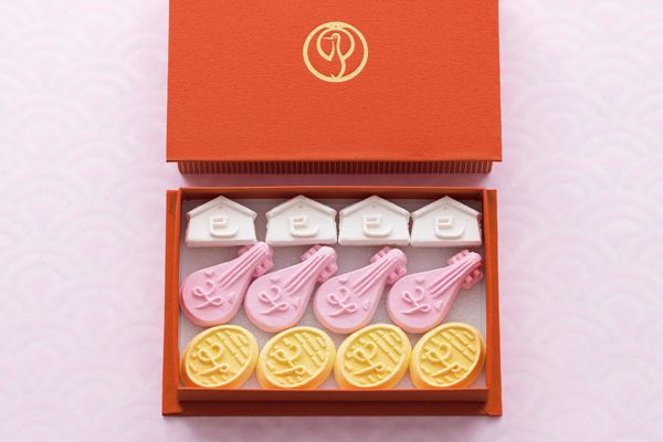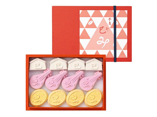 新年を祝う伝統の干菓子詰合せ。「巳(み)」をあしらった絵馬や小判などの縁起の良いモチーフ3種類。楽器の琵琶は七福神の一人である弁財天と、その遣いとされる白蛇を表現しています。和三盆入り落雁は、口の中ですうっと溶ける繊細な味わい、上質でやわらかな甘味。ゆっくりと味わってみて。定番のお抹茶、あたたかい日本茶のほか、コーヒーなどにもよく合います。 新年のお茶席をはじめ、日々のお茶のおともにも。