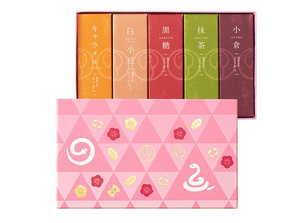 素材から厳選した人気のミニ羊羹5種(小倉・抹茶・黒糖・白小豆・キャラメル)を、「巳」デザインをあしらった新春限定のBOXに詰め合わせています。幸運を招く白蛇に、魔除けの鱗模様、吉祥の宝尽くし文様を添えて。金の箔押しがきらりと光るパッケージはミニサイズながらも高級感があり、ちょっとした手渡しギフトにもぴったりです。