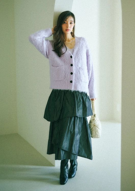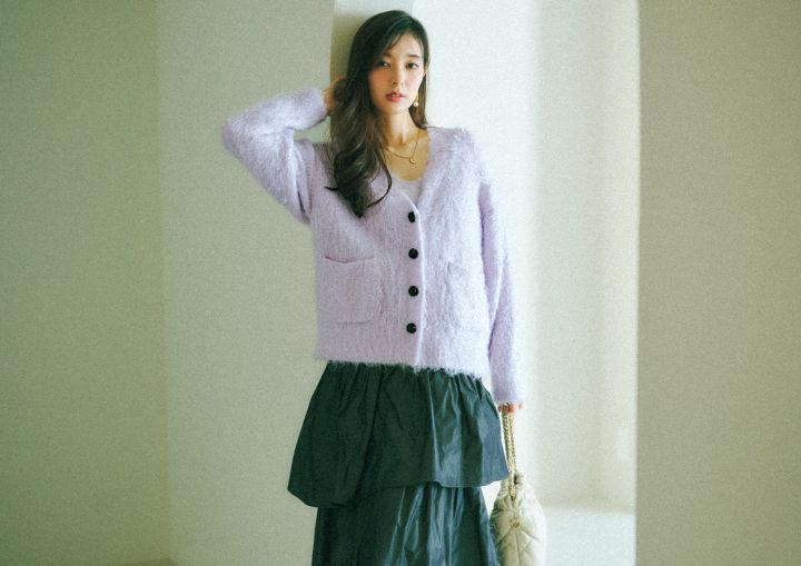 毛足長めのウォーミーな素材感が、やわらかなニュアンスをアシスト。ネックレスの華やぎを加えれば、肩ひじ張らない女っぽさが薫ります。ボリュームスカート合わせでキャッチーにキメて。