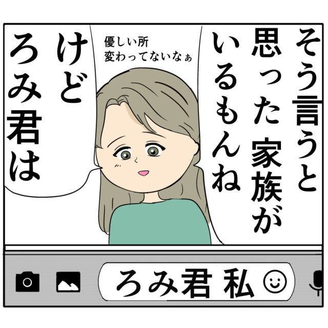 ろみ緒さんからの返信を見たジュリ実さんは、「そう言うと思った。家族がいるもんね。優しい所変わってないなぁ。けどろみ君は」そう呟きながら「ろみ君、私」とろみ緒さんにメッセージを送ります。