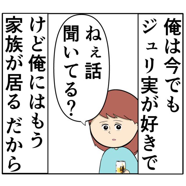 「俺は今でもジュリ実が好きで、けど俺にはもう家族が居る。だから」と心の中で葛藤するろみ緒さんに「ねぇ話聞いてる?」と話しかけるめいさん。