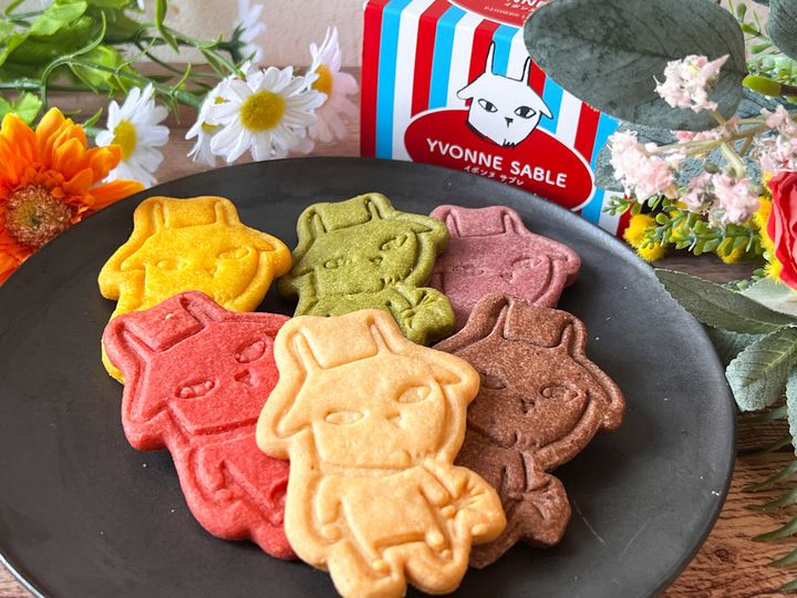 岩手県宮古市の洋菓子店「レ・ド・シェーブル」が販売する「イボンヌサブレ」。パッケージにも描かれたお店のキャラクター・イボンヌちゃんを象ったカラフルなラスクです。