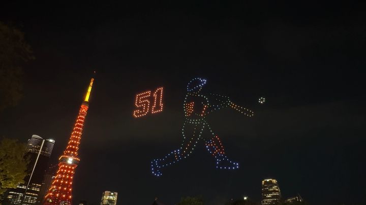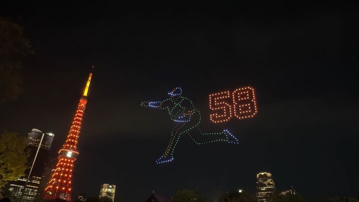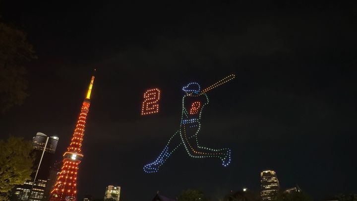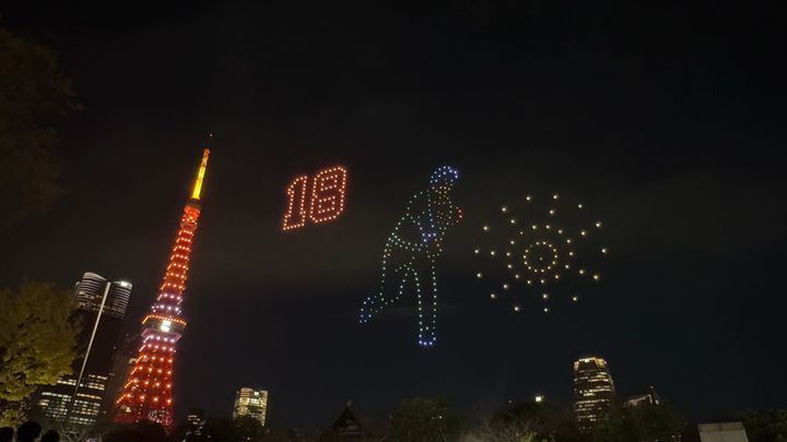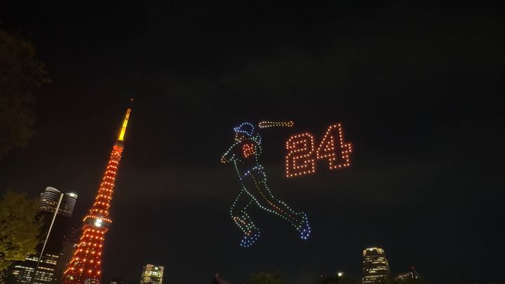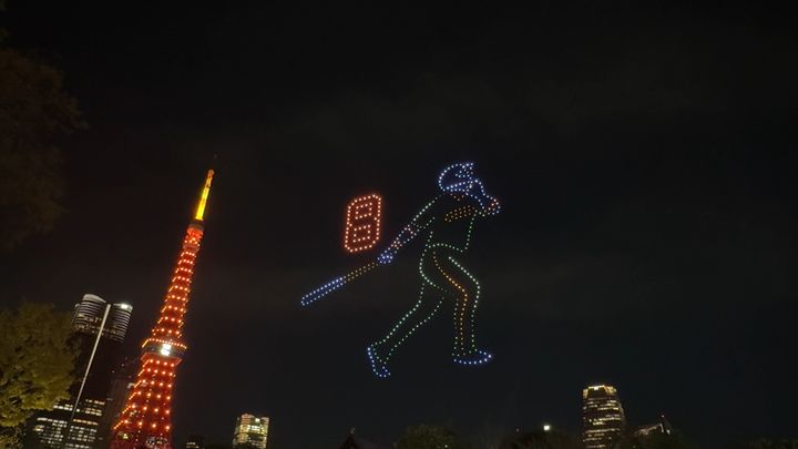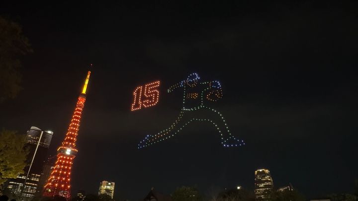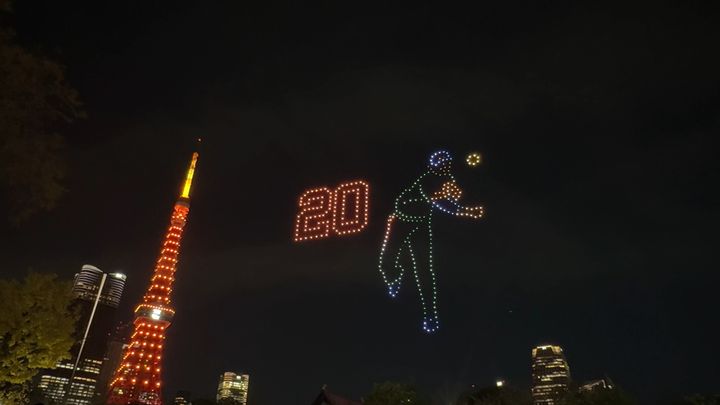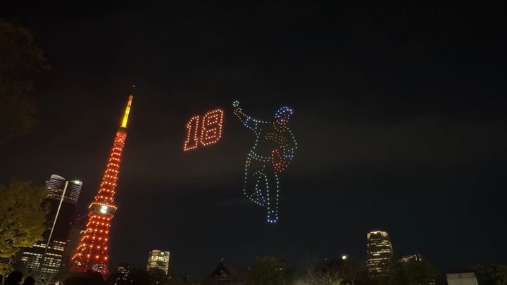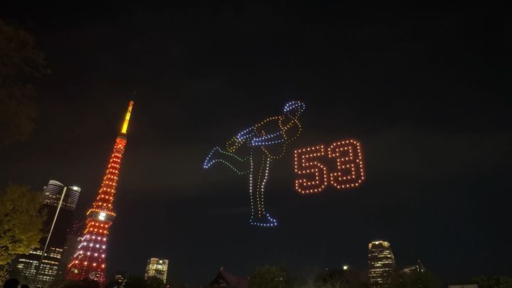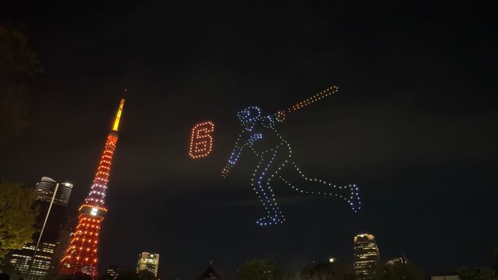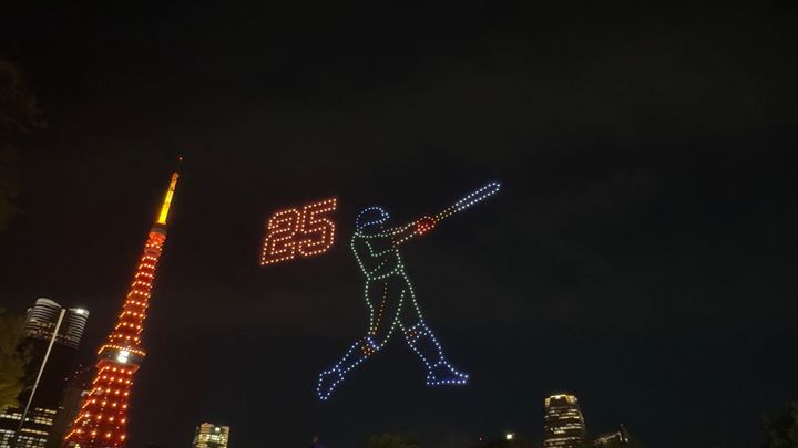 この後も、続々と読売ジャイアンツの選手が東京タワー前上空に描かれていった。 各選手、ヒットシーンや投球の様子といった活躍がドローンによるアニメーションで描かれた。