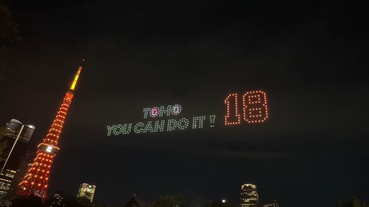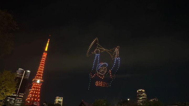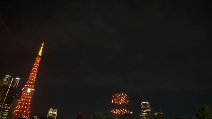 東京タワーのライトアップが行われた5分後、19時5分ごろからはドローンショーが始まった。 増上寺境内からモーター音が芝公園まで響いてきた後、赤いライトを灯したドローンたちの姿が確認されると、再び芝公園は歓声で沸いた。