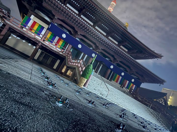 東京タワーのライトアップとドローンショーが行われたのは、12月26日19時から。 当日、イベントが間近に迫る18時半過ぎに、DroneGuide編集部はドローンショーを担当する株式会社レッドクリフの方に案内していただき、ドローンが待機している三縁山・増上寺境内に。