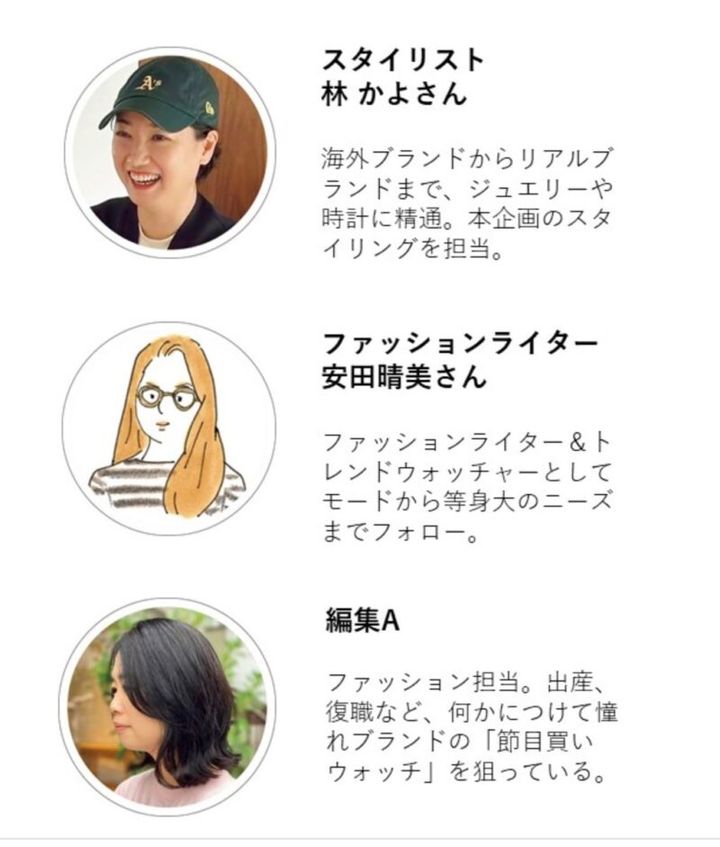 編集A 等身大で楽しめる時計やジュエリーは、ファッションや気分に合わせて替えられるのが魅力。手ごろな価格だから重ねづけしたり、ミックスしたり、コーディネイトも楽しいですね。
