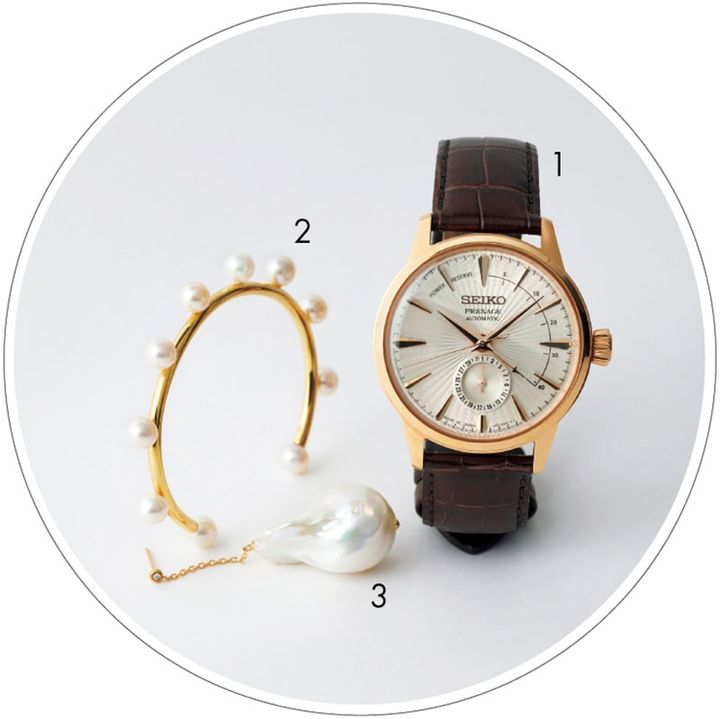 1.大ぶりながらクラシカルで上品なデザイン。波打つような煌めきを放つ文字板が美しい。機械式(自動巻き+手巻き)の本格仕様。時計¥81,400(セイコー プレザージュ/セイコーウオッチ) 2.淡水パールを並べたシンプルさが可愛い。時計のゴールドカラーともベストマッチ。バングル[淡水パール、SV、K18Gプレート]¥85,800 3.とびきり大きな淡水パールのピアスで、遊び心と個性を表現。ピアス[K18YG、淡水パール、DI]¥48,400※片耳売り(ともにビジュードエム/ビジュードエム六本木ヒルズ)