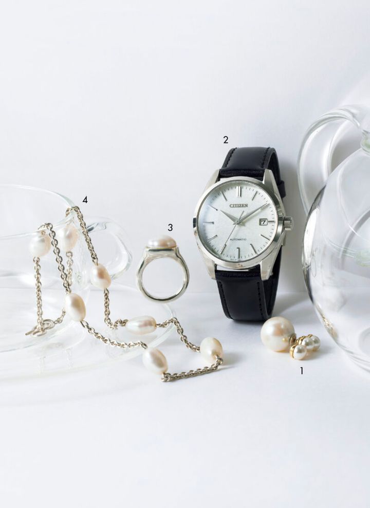 1.大粒パール付きのキャッチが斬新。ピアス[ガラスパール、メタル、樹脂パール]¥14,300(マユ/マユ ショールーム) 2.漆と銀箔を組み合わせた文字板と、バーインデックスのミニマルさがクール。本格的な機械式(自動巻き+手巻き)で差をつけて。時計¥154,000(シチズン/シチズンお客様時計相談室) 3.淡水パールのユニークな形が目を引く。リング[SV、淡水パール]¥33,000 4.一粒ごとに表情が違う大きな淡水パールが時計のボリュームとマッチ。ネックレス[SV、淡水パール]¥29,700(ともにプラウ)