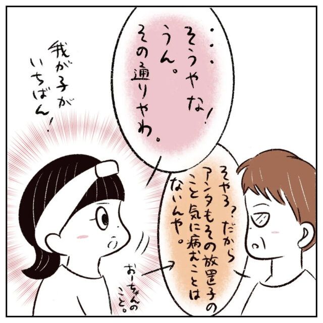 「・・・そうやな!うん。その通りやわ」お母さんの言葉を聞いてハッとしたまるさんは、我が子がいちばんだと改めて気付きました。お母さんは「そやろ?だからアンタもその放置子のこと気に病むことはないんや」と言ってくれました。