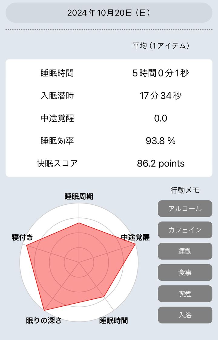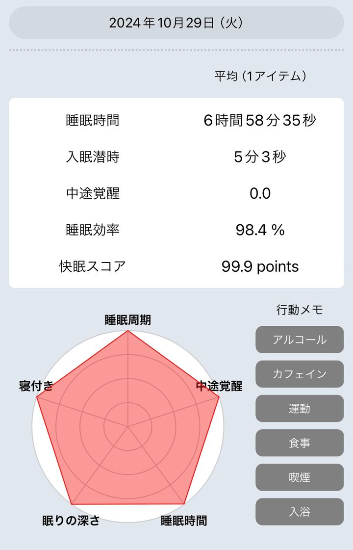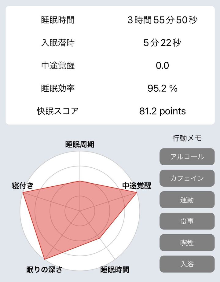 初日、とにかく着心地の良さに驚きました。肌触りが柔らかくて心地がよく、着た瞬間に自然と肩の位置が下がるようなリラックス感をまとうことができて、なんとも不思議な感覚…寝つきが良くなったおかげか、朝起きた時の疲労感が軽減されたような気がします。睡眠の状態を知ることができるアプリ「Sleep Meister」の計測データでも、初日と比べると快眠スコアが若干上昇傾向に変化しました!