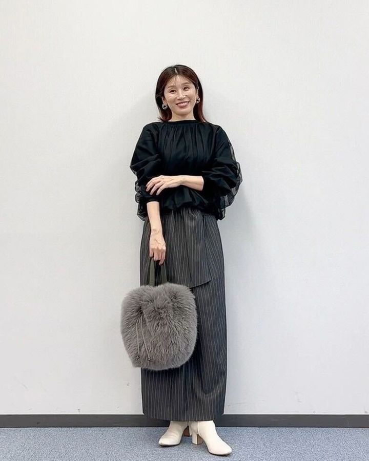 こちらはブラックをチョイスして大人の甘さと気品を演出。アイテムごとの異素材合わせがオシャレ度をワンランクアップさせます。カッチリしすぎない雰囲気でオフィスシーンもお出かけシーンにも使えるスタイルです。