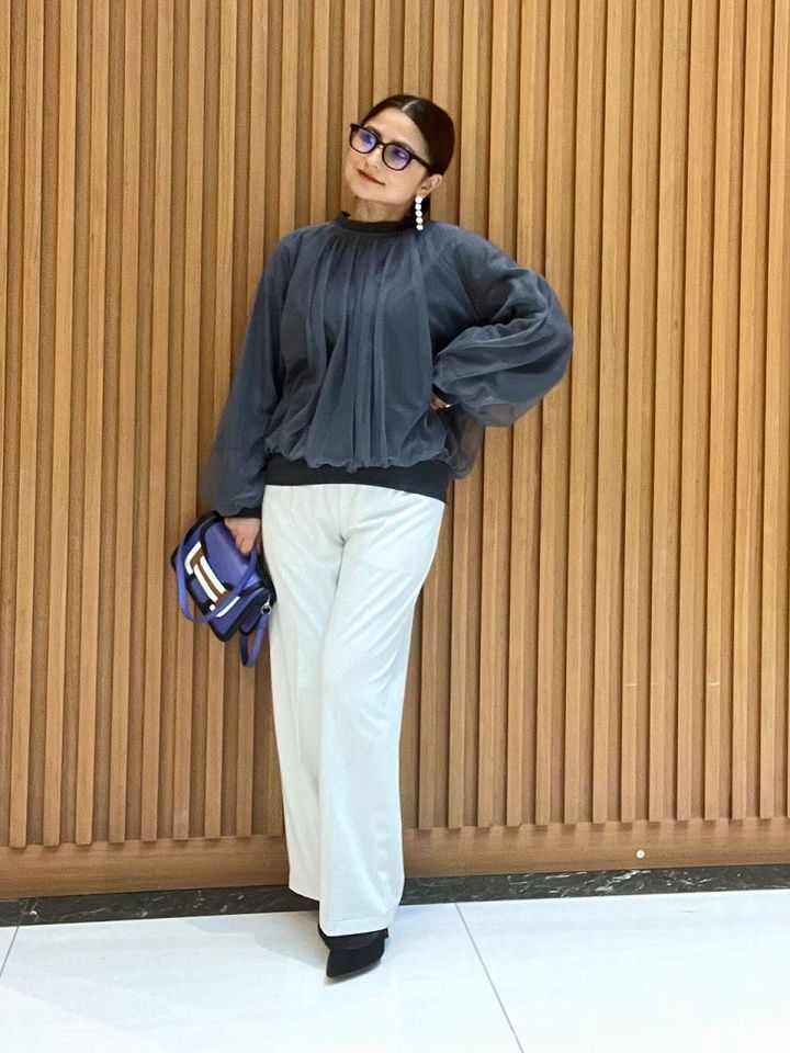 上品にホワイトパンツとあわせたキレイめカジュアルなスタイル。ボリュームある華やかなトップスにはボトムスはシンプルな形を選んでも◎。低身長さんでも長過ぎない丈感がコーデのバランスを整えてくれます。