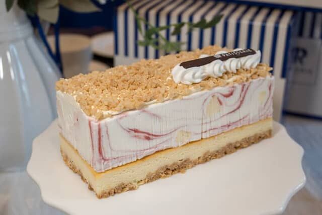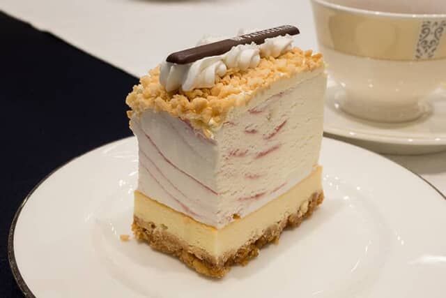 ベイクドチーズケーキとクランチの上に、甘酸っぱいストロベリーリボンのアイスクリームが載っています。