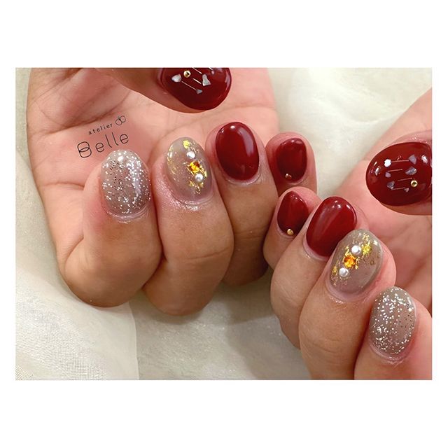 キラキラゴールドと深みボルドーであたたかい華やかネイルが完成