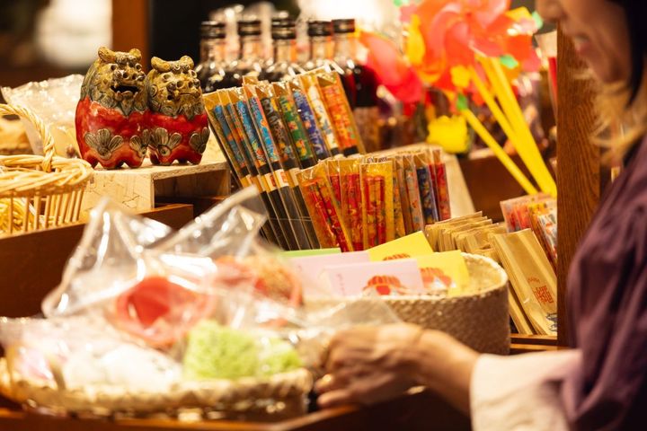 街を知り尽くしたスタッフがおすすめする、周辺店舗の商品が、OMOベース1階フロント前に集結。沖縄の焼き物「やちむん」や「琉球ガラス」、「シーサー」、「紅型(びんがた)」のほか、沖縄のローカル菓子や行事に使われる玩具「カジマヤー(風車)」など、選りすぐりの商品が並びます。なんとその数17店舗!