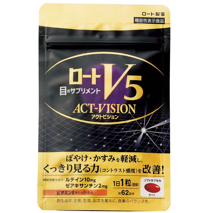 PCやスマホを長時間見たり、小さな文字が見えにくいと感じたらサプリの摂取を。見る力を改善する成分ルテインとゼアキサンチンが配合され網膜にアプローチ。ロート V5 アクトビジョン ¥5,400(ロート製薬)