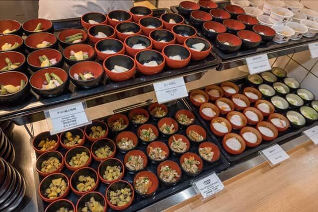 朝から楽しい多彩な味は、ご当地グルメや海鮮丼、小鉢料理、揚げ物、サラダなど。牛乳は、宮城県の蔵王連峰に係わる36か所のビュースポットから名づけられた「蔵王三十六景牛乳」を用意します。
