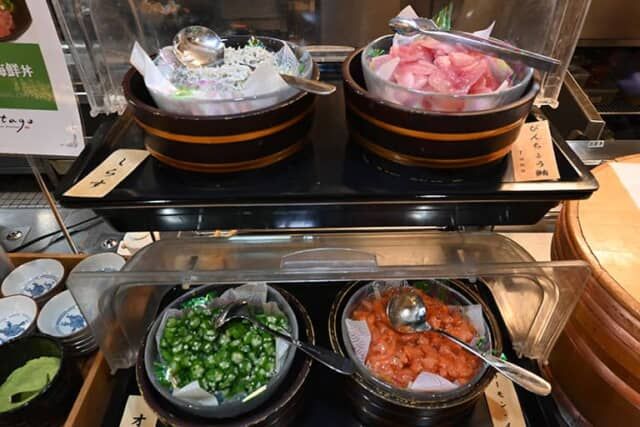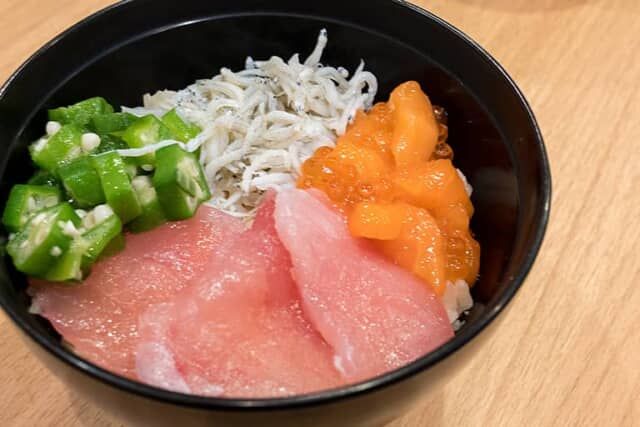 お好みの具材を使ってオリジナル海鮮丼も作れます。この日のは、いくらサーモン、びんちょうマグロ、しらす、おくらで、ご飯は酢飯と白米から選べます。
