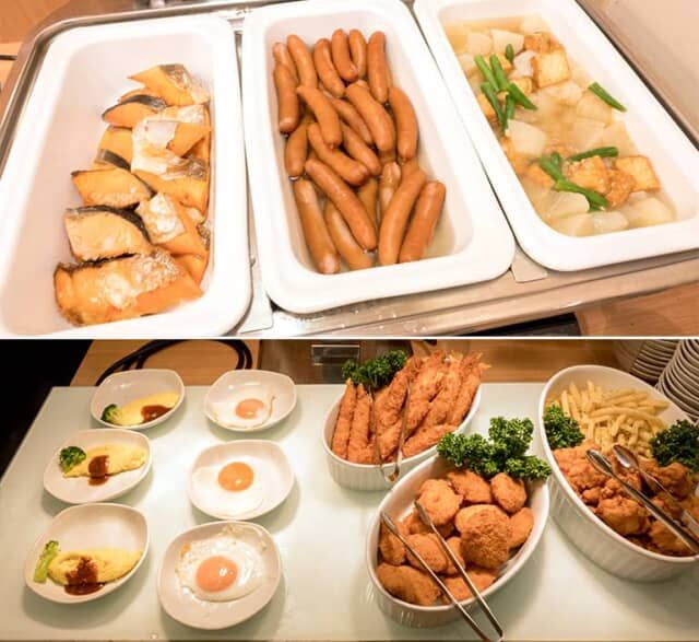 ソーセージや焼き魚のほか、オムレツや目玉焼きなどの卵料理、天ぷらや唐揚げ、フライドポテトなどの揚げ物が並びます。