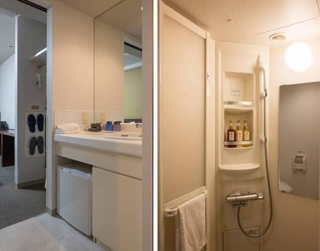 歯ブラシや髭剃りなどのアメニティーは、フロントロビーのアメニティーバーからピックアップ。大浴場があるため、全室シャワーブースになっています。
