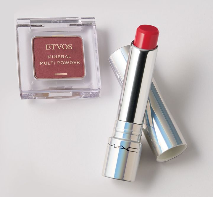 エトヴォスのマルチパウダーを上下まぶたに、M・A・Cのリップバームを頰と唇にON。指でささっとぼかして湯上がりみたいな血色ピンクのワントーンメークに。
