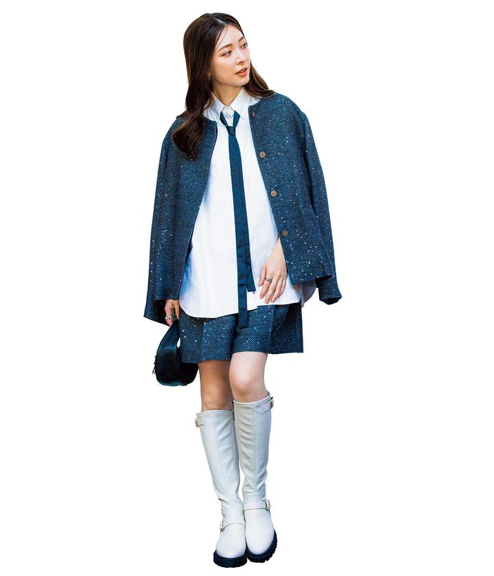ジャケット¥86,900パンツ¥55,000(ともにエッフェ ビームス/ビームス公式オンラインショップ)シャツ¥11,550(カランシエル/シップス インフォメーションセンター)バッグ¥17,600(コエル/ビッグヒット〈コエル事業部〉)シューズ¥33,000(ダイアナ/ダイアナ 銀座本店)ピアス¥3,960〈KRONOS〉左手リング¥2,750〈ヘンカ〉(ともにロードス)右手リング¥9,900(ワンエーアールバイウノアエレ/ウノアエレ ジャパン)