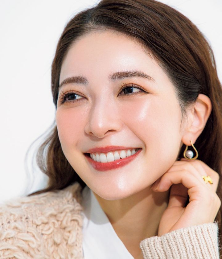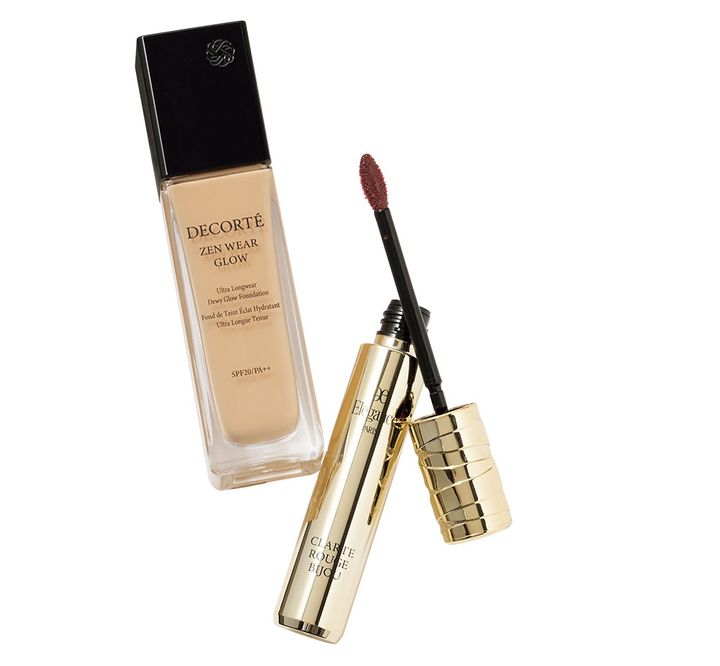 (物右)ぷるんとしたツヤと潤いが続く唇に。クラルテ ルージュ ビジュー 05 ¥3,850/エレガンス コスメティックス (物左)薄膜でカバー力もあり上品なツヤ肌に。ゼン ウェア グロウ SPF20/PA++ 30㎖ 全10色 ¥7,700/コスメデコルテ カーディガン¥23,100(カデュネ/カデュネ プレスルーム)ブラウス¥37,400(ソブ/フィルム)ピアス¥58,300(アナプノエ/フォーティーン ショールーム)リング¥27,500(スキャット/ロードス)