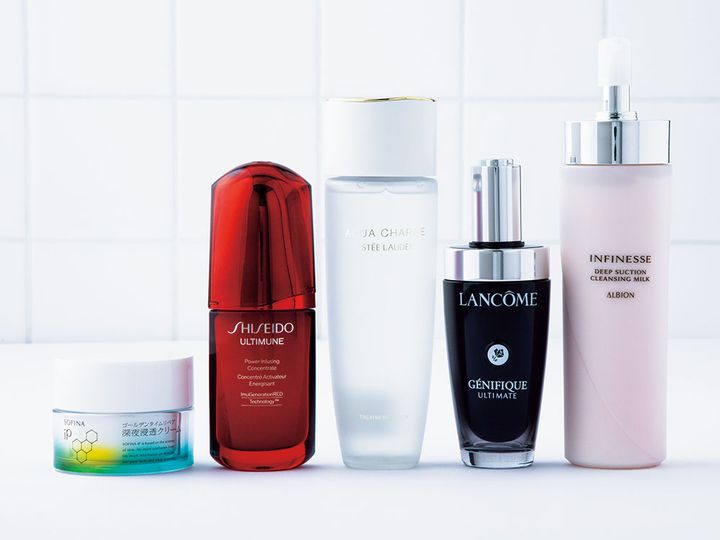 (右から)ミルクベースのクレンジングで潤いながらメークオフ。アンフィネス ディープ サクション クレンジングミルク 200g ¥4,950/アルビオン 美の回復を助けるブースター。ジェニフィック アルティメ セラム 50㎖ ¥17,820/ランコム 角層深くまで潤いを。アクア チャージ 薬用 トリートメント ローション[医薬部外品]200㎖ ¥7,590/エスティ ローダー 多忙な日々でのケア不足肌も潤う。SHISEIDO アルティミューンTM パワライジング コンセントレート IIIn 50㎖¥13,200 眠っている間に角層細胞まで保湿。ソフィーナiP ゴールデンタイムリペア深夜浸透クリーム 55g ¥2,970(編集部調べ)/花王