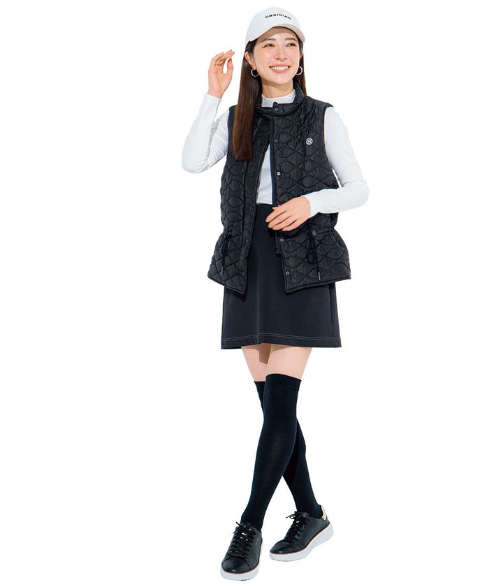 ベスト¥58,300トップス¥25,300スカート¥47,300キャップ¥14,300ソックス¥6,490(すべてオブシディアン/オブシディアン 二子玉川店)シューズ¥27,500(コール ハーン/コール ハーン ジャパン)ピアス¥33,000(ミチ ウィルウェイ/フォーティーン ショールーム)