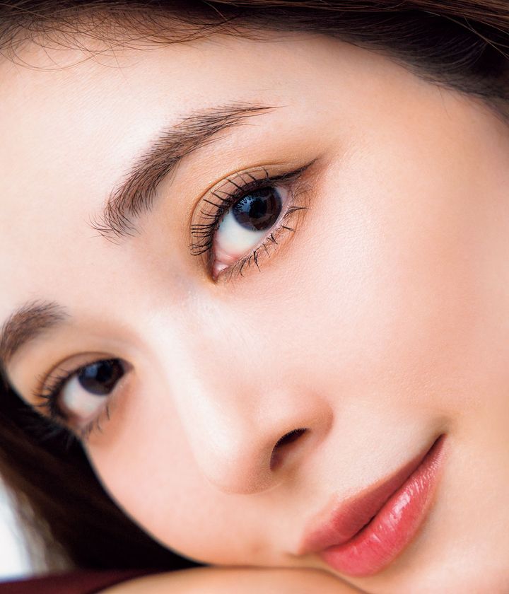 アイラインを目尻より5㎜細く長くオーバーに描き、アイシャドウでぼかす。上下まつ毛にマスカラをして印象的に。チークは頰と鼻先にふんわりと入れてほんのり血色感を感じるくらいに。上唇の山をオーバーリップにして人中短縮に見せます。