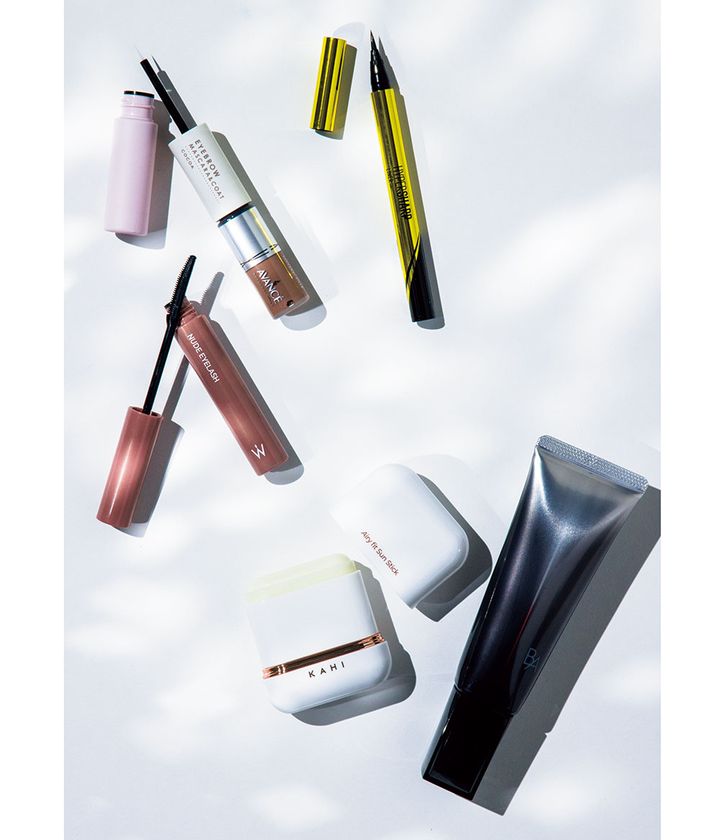 <上右>崩れ知らずの極細ライン。ハイパーシャープ ライナー R BK-1¥1,290/メイベリン ニューヨーク <上左>眉マスカラと汗から眉を守るアイブロウコートのWエンド。アイブロウマスカラ&コート ココア ¥1,430/アヴァンセ <下>まつ毛を根元からしっかり上げてカールキープするのに柔らかく見える処方。ウォンジョンヨ ヌードアイラッシュ 01 ¥1,430/Rainmakers