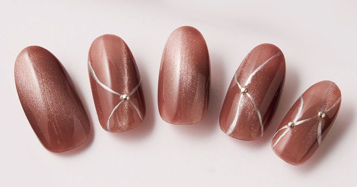 オフィス・学校・イベントにもぴったりなデザインにネイルチェンジ! 上品なベージュピンクに華やかさをプラスした流れるようなラインのマグネットネイル。¥14,550〜(広尾店・齊藤 澪さん)
