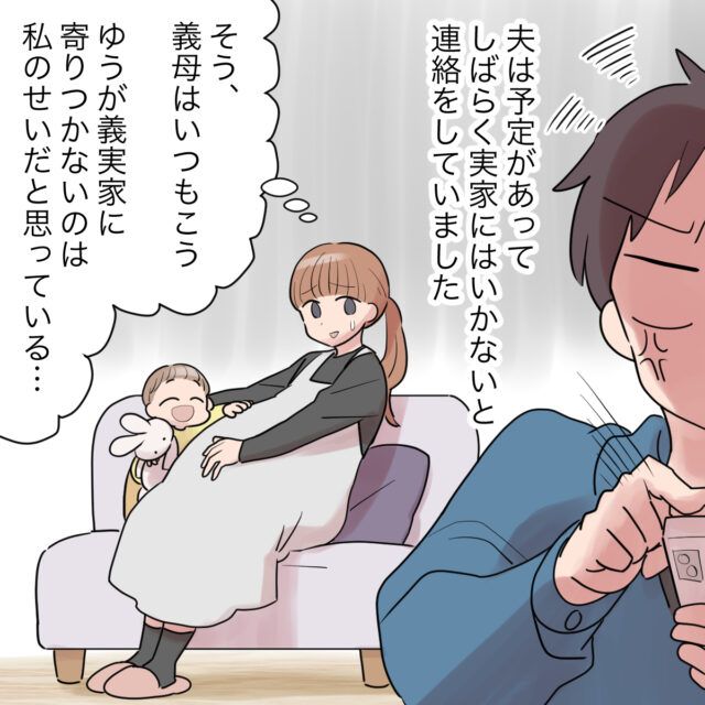 その後、ゆうさんは「予定があって、しばらく実家にはいかない」と連絡をしていました。「そう、義母はいつもこう・・ゆうが義実家に寄り付かないのは私のせいだと思ってる・・」マキさんはゆうさんの様子を見ながらそう心中で呟きました。