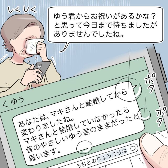 「ゆうくんからお祝いがあるかな?と思って今日まで待ちましたがありませんでしたね」「あなたは、マキさんと結婚してから変わりましたね。マキさんと結婚していなかったら、昔のやさしいゆうくんのままだったと思います」と義母はマキさんを責めるようなメールを送って来ました。