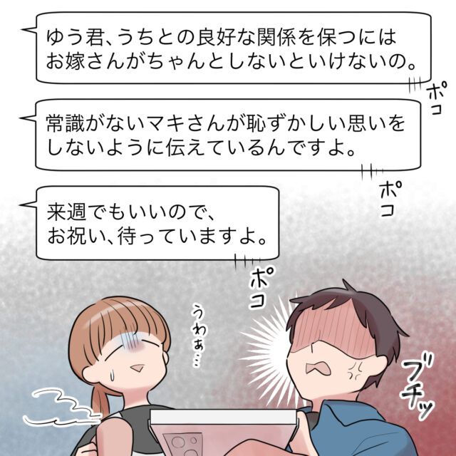 さらに、「ゆうくん、うちとの良好な関係をタモツにはお嫁さんがちゃんとしないといけないの」「常識がないマキさんが恥ずかしい想いをしないように伝えているんですよ」「来週でもいいので、お祝い、待っていますよ」次から次へと送られてくる義母からのメールにゆうさんの怒りはマックスに!!