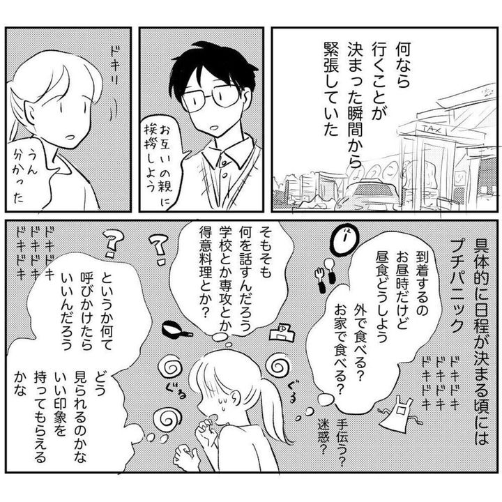 さざなみさんは緊張のなか、彼の実家へ挨拶に行きます。何を話そう、どんな食事なんだろう、そんな緊張と不安を感じるさざなみさんを見て、当時の自分と重ねた人もいるかもしれません。