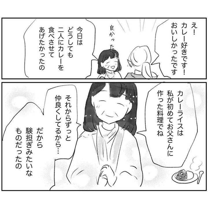 カレーを出した義母の気持ちを知ったさざなみさん。大事なわが子とさざなみさんの将来がよいものであってほしいと思う義母の優しさがとても伝わってきます。カレーは義母にとって大切な献立。それを作るという母の優しさはさざなみさんにも伝わり、忘れられないエピソードになったようです。